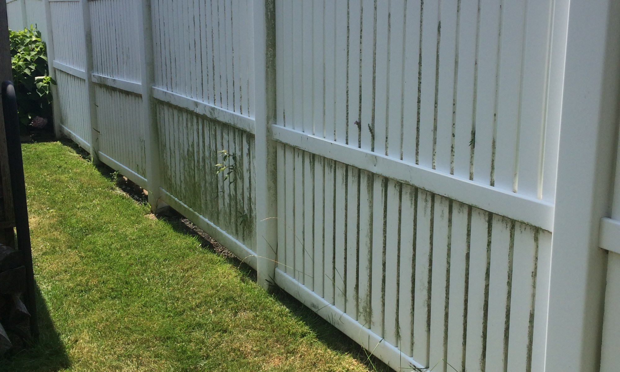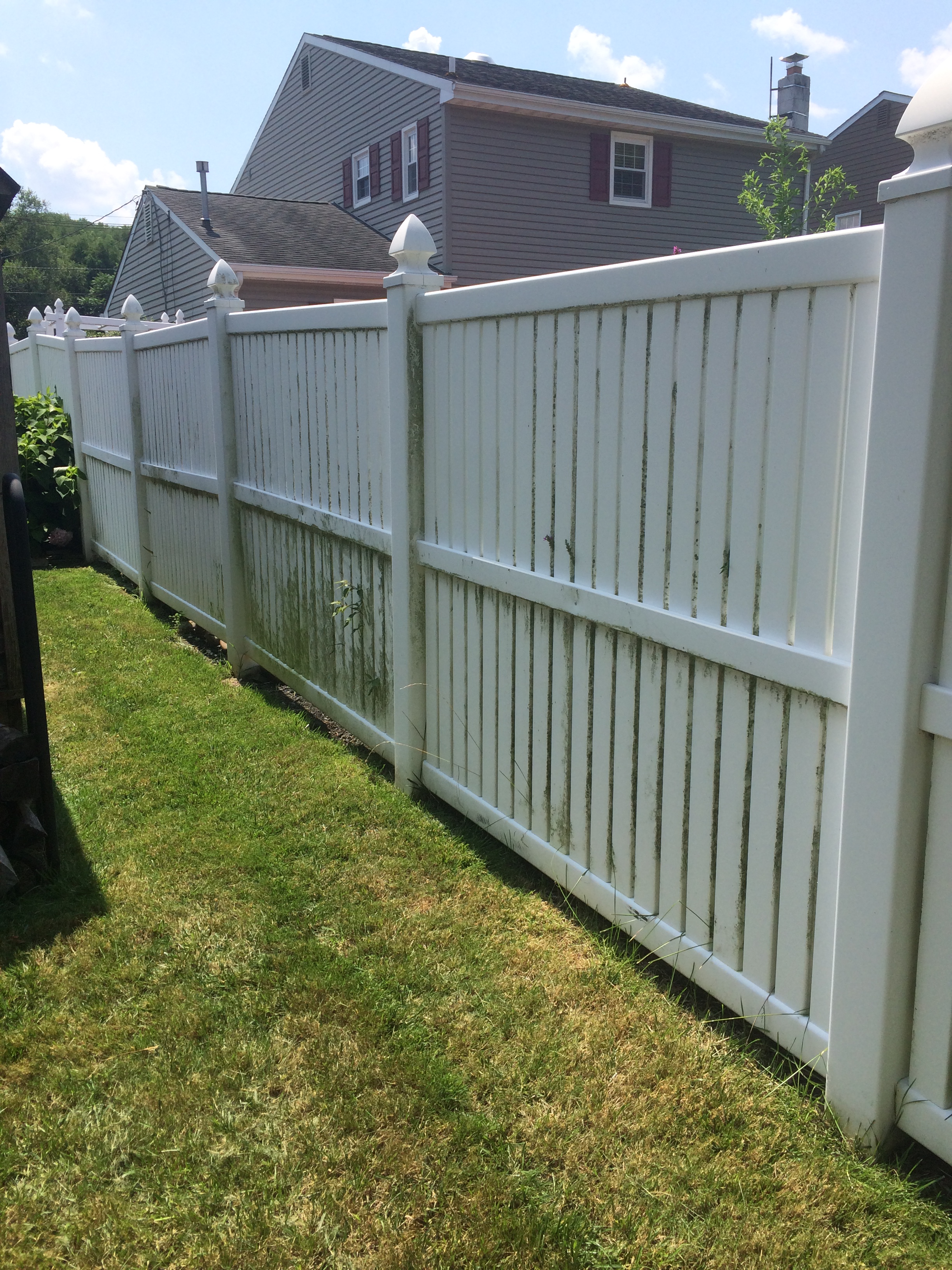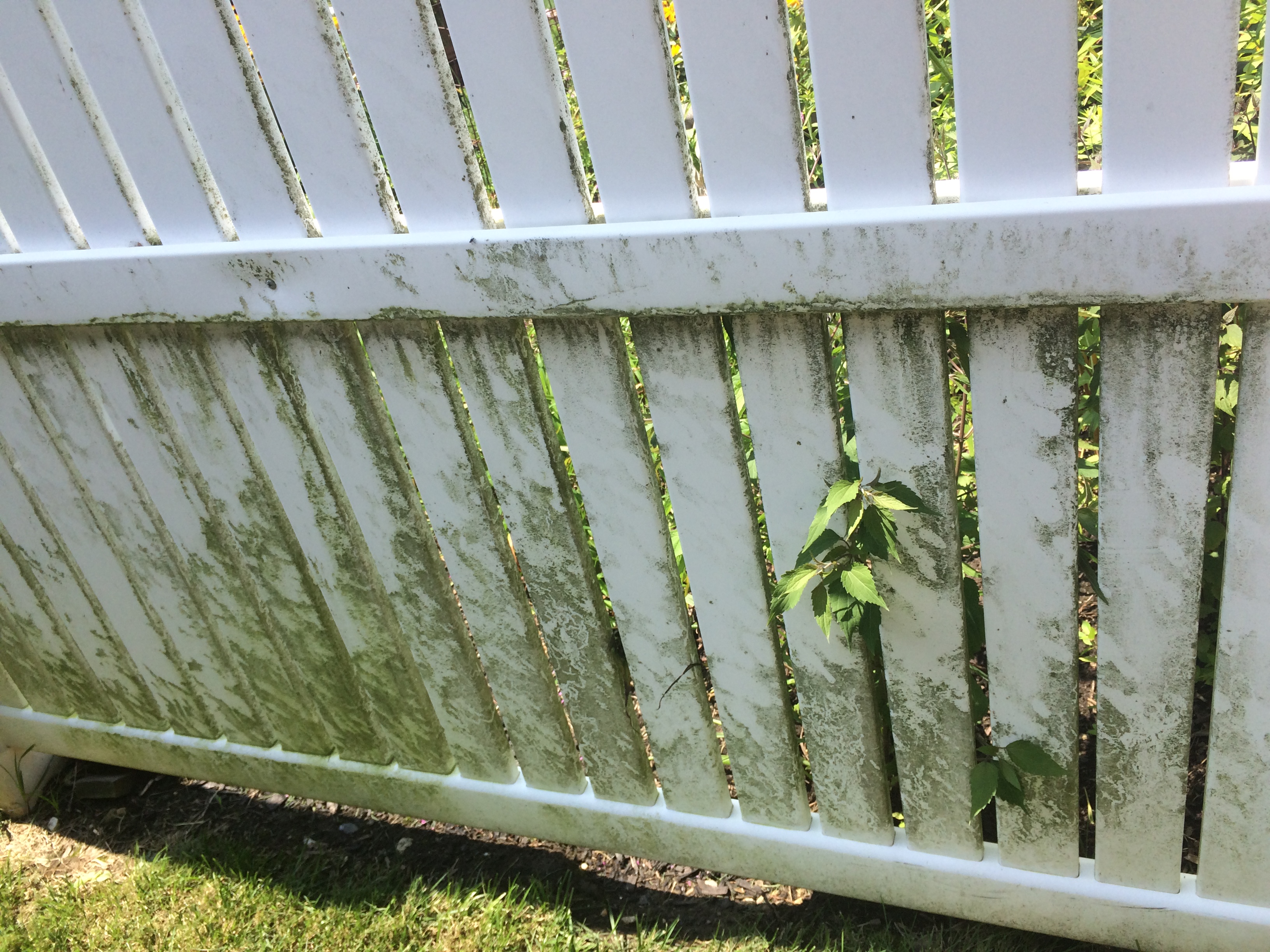 The above pictures are of my backyard PVC fence. The first year I hand-scrubbed the ENTIRE thing with a bit of bleach and water…I know. But, it worked! The second time, the third year, I used “insert pressure washer name” and only good ol’ H2O, water! Just follow the instructions online here or pictured on the machine.